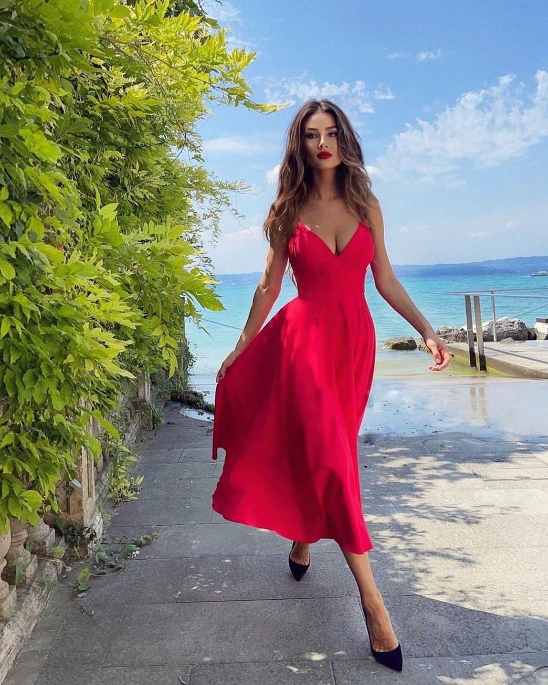 • Feminine red midi dress. Open back, thin shoulder straps and a flirtatious neckline.