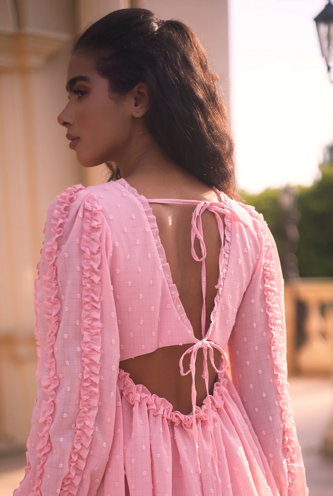 • Pink mini dress with long puff sleeves and a 'V' neckline. Cut under the bust with an open back with a tie.
